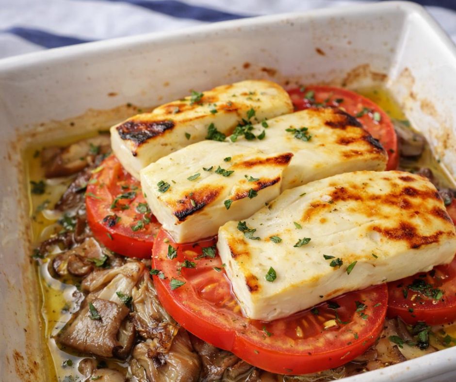 Zapiekany ser halloumi na aromatycznych boczniakach z czosnkiem, białym winem i skórką cytryny, uzupełniony soczystym pomidorem
