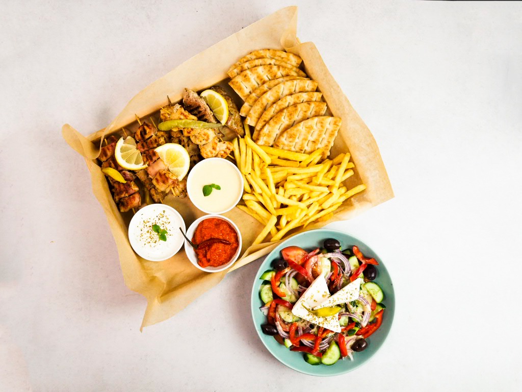2x kalamaki drobiowe, 2x kalamaki wieprzowe, 2x kalamaki ketobeikon, 2x kofta, frytki, sałatka grecka, 2x chlebek pita, sos tzatziki, pikantna salsa pomidorowo-ziołowa, sos musztardowy