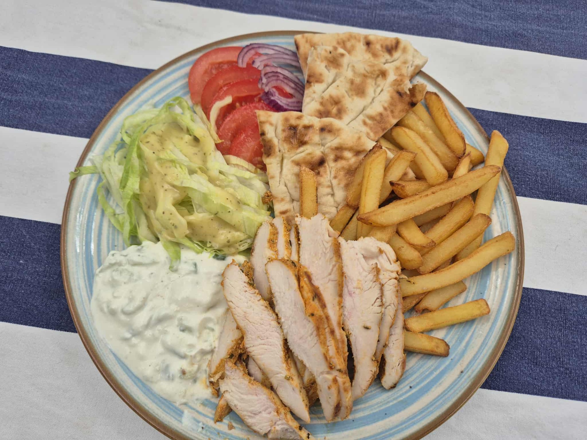 4x kalamaki drobiowe, 4x kalamaki wieprzowe, 4x grillowany ser halloumi, grillowana grecka kiełbasa, duża sałatka grecka, 2x grillowany chlebek pita, frytki, sos tzatziki, sos musztardowy, pikantna salsa pomidorowo-ziołowa
